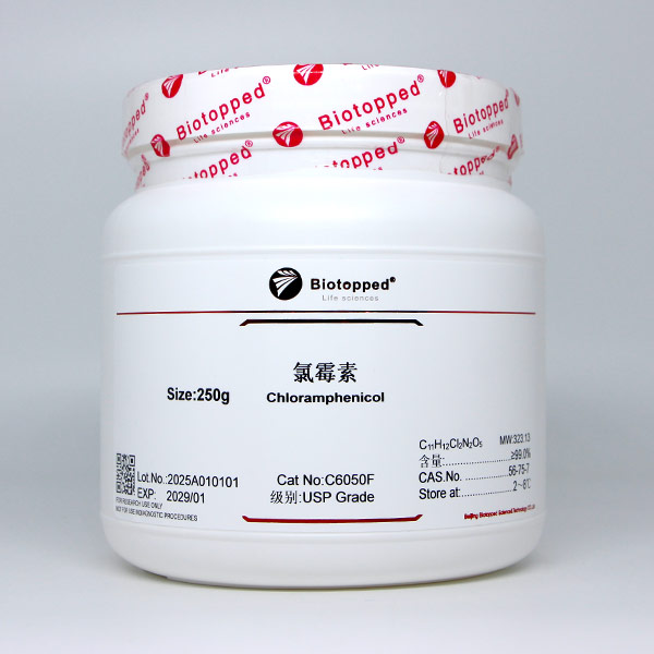 氯霉素,英文名称Chloramphenicol,一种细菌性广谱抗生素,可在肽键转移酶催化形成肽键的过程中抑制50S核糖体上mRNA的翻译,从而抑制革兰氏阴性和革兰氏阳性细菌的生长。此外氯霉素还具有立克次体属微生物抗性以及鹦鹉热-淋巴肉芽肿类衣原体抗性等,因此氯霉素可用于细菌筛选。对氯霉素乙酰转移酶基因(即CAT gene)进行乙酰化可抵制氯霉素的抗性。基于该原理,分子生物学实验中,氯霉素可作为一种筛选药物用于筛选含有氯霉素抗性基因的转化细胞。