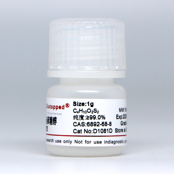 用途:本品仅供科研,不得用于其它用途。(以下用途仅供参考)还原巯基或二硫键的试剂。二硫赤藓糖醇和二硫苏糖醇是互为同分异构体,同时又被称作克莱兰氏试剂(Cleland’s reagent)。它们都具有保护巯基(-SH)免遭氧化、同时也可使二硫化合物定量地还原成巯基的作用,是切断蛋白质中二硫键的主要生化试剂