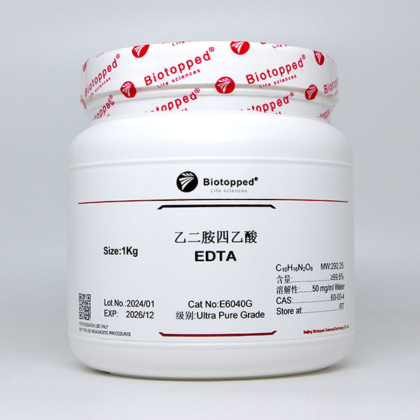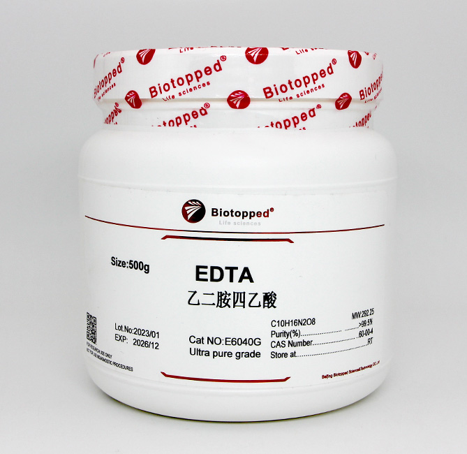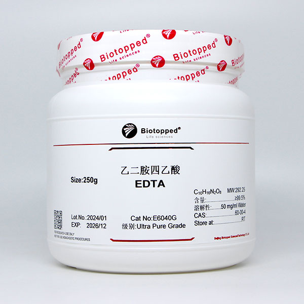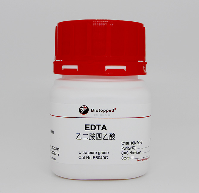 乙二胺四乙酸别名EDTA,白色粉末。溶于氢氧化钠、碳酸钠和氨溶液等碱性溶液中,微溶于水,不溶于乙醇等有机溶剂。其二钠盐应用更为广泛。因为乙二胺四乙酸能与Mg2+、Ca2+、Mn2+、Fe2+等二价金属离子结合的一种螯合剂。多数核酸酶类和一些蛋白酶类的作用需要Mg2+,所以EDTA常用做核酸酶、蛋白酶的抑制剂;也可用于消除重金属离子对酶的抑制作用。