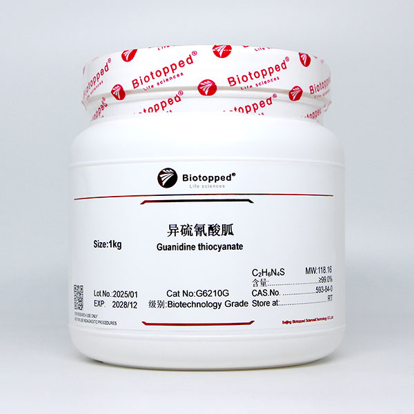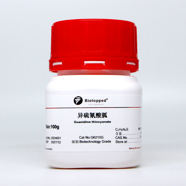 异硫氰酸胍生物学用途:异硫氰酸胍是一种解偶剂,是一类很强的蛋白质变性剂,可溶解蛋白质,并使蛋白质二级结构消失,细胞结构降解,核蛋白迅速与核酸分离。