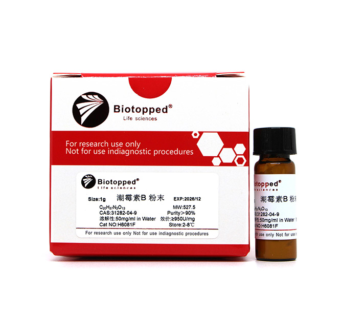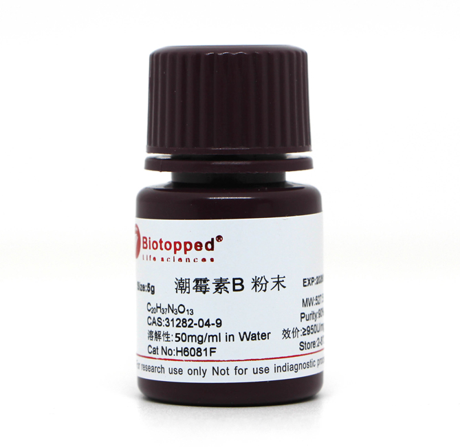 潮霉素B(Hygromycin B)是由吸水链霉菌(Streptomyces hygroscopicus)代谢产生的一种氨基糖苷类抗生素,通过干扰70S核糖体易位和诱导对mRNA模板的错读而抑制蛋白合成,从而杀死原核(如细菌)、真核(如酵母菌,真菌)和高等哺乳动物真核细胞。