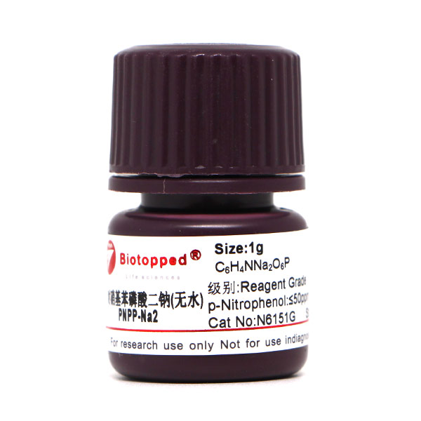 用途:本品仅供科研,不得用于其它用途。(以下用途仅供参考)测定酸性和碱性磷酸酶(phosphatases)的显色底物;反应能产生黄色的末端产物,在波长405nm可以读取,该反应能被3 N NaOH溶液终止。