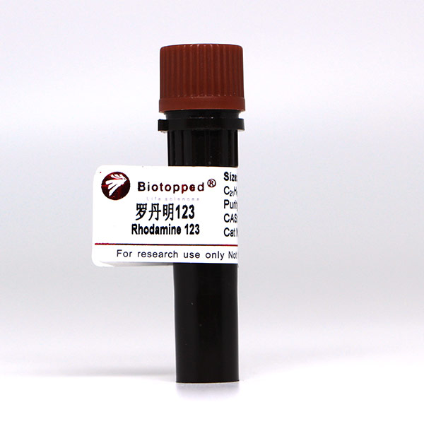 罗丹明123是一种常用的阳离子绿色荧光染料,可以透过细胞膜从而在活细胞线粒体内聚集,并发出黄绿色荧光。广泛用作检测线粒体膜电位的荧光探针,并且对细胞没有任何毒性。