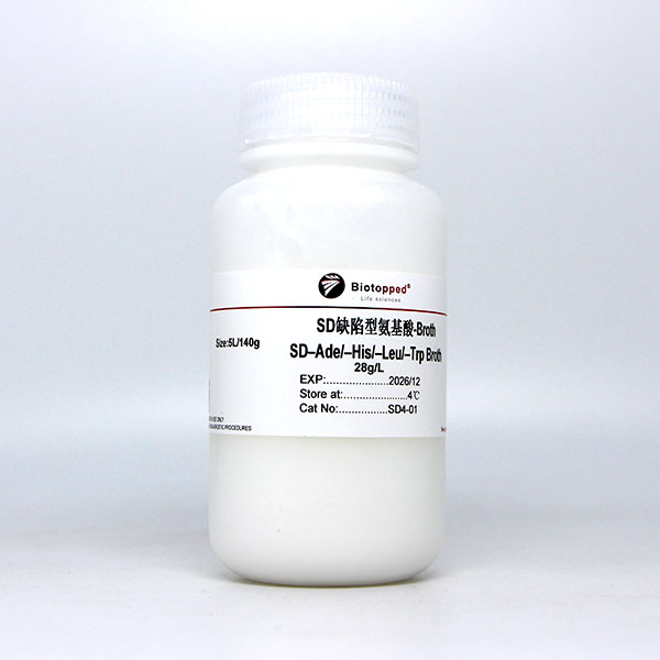SD+缺陷型氨基酸混合物是由Minimal SD Base与缺陷氨基酸混合物混合而成,(SD酵母缺陷筛选培养基中含有葡萄糖碳源)如SD/-His Broth即Minimal SD Base混合了DO Supplement-His。用做筛选培养基,用于选择培养含有特异载体的酵母或进行杂交筛选。又如,SD/-Leu Broth,SD/-Trp Broth分别用于筛选bait和prey载体(bait和prey载体带有合成色氨酸和亮氨酸的基因)。携带这两个载体的酵母细胞可以在双缺筛选培养基SD/-Leu/-Trp生长,而不含有这两个基因的亲代酵母菌株(如Y2H Gold)不能生长。