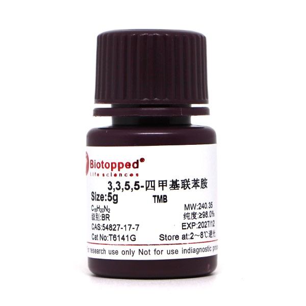 产品应用:过氧化物酶和乙型肝炎抗原的染色剂。是一种新型安全的色原试剂。与传统的色原试剂联苯胺、邻联甲苯胺及邻苯二胺等相比较,TMB具有检测灵敏度高、稳定性好等优点,而且使用安全。经动物试验和Ames细菌自动变异性试验结果表明,TMB为非致癌物和非致突变物。目前TMB已在逐步取代强致癌物联苯胺和其他致癌性的联苯胺衍生物,应用于临床化验、法医检验、刑事侦破及环境监测等领域。尤其是在临床生化检验方面,TMB作为过氧化酶的新底物,在酶免疫分析法(EIA)和酶联免疫吸附检验法(ELISA)中获得了广泛的应用。