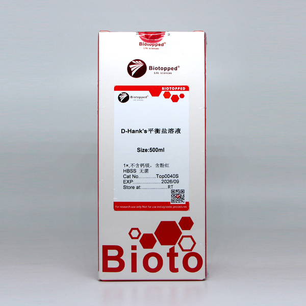 D-Hanks 平衡盐溶液(1×,含酚红),不含 Ca2+、Mg2+ ,含酚红,用重蒸超纯水配制,pH 值 7.4,经严格过滤除菌处理,内毒素含量低,可用于胰蛋白酶-EDTA 细胞消化液等各种无或低钙镁细胞培养用液的配制以及组织和细胞的漂洗等。