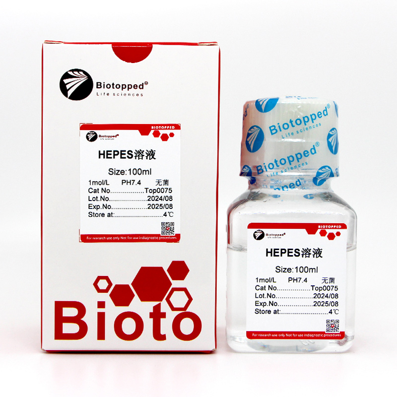 HEPES 用于细胞培养时使用终浓度为10-25mM,在开放式培养或细胞观察时能维持较恒定的PH值。本公司生产的HEPES 缓冲液均经过无菌处理,可直接用于细胞培养。4℃保存可延长产品保质期,长期不用建议低温保存。