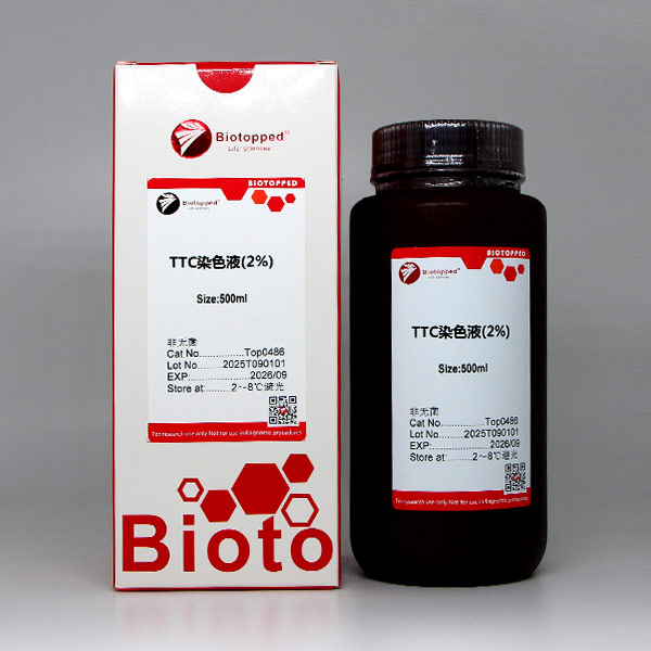 TTC染色液(2%)对心肌梗死及脑组织坏死区的观测较电镜早3~6h,较光镜早24h,多用于尸检中的新鲜心脏组织和脑组织以及实验动物模型早期梗死组织的染色。其特点:①TTC染色直接取材于新鲜组织即可染色,无需固定、包埋等步骤;②TTC染色时间短,一般20~30min;③TTC染色液可重复使用,10ml可染20张片子。该试剂仅用于科研领域,不适用于临床诊断或其他用途。