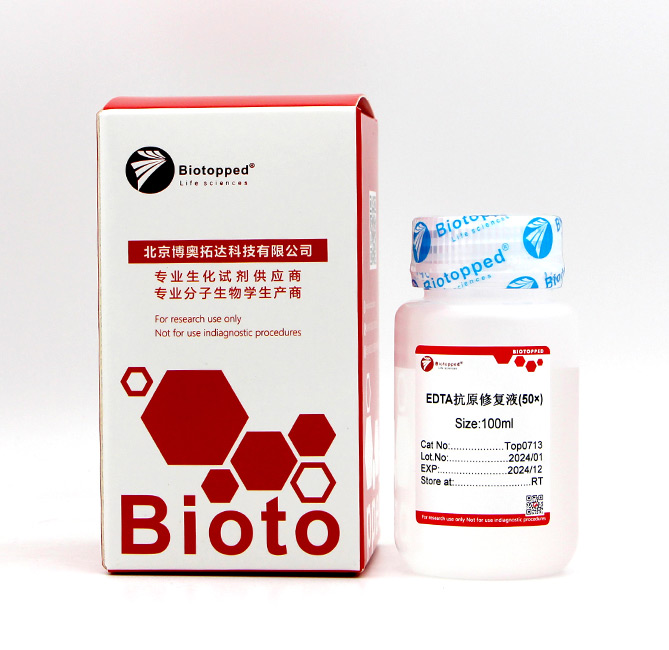EDTA 抗原修复液(EDTA Antigen Retrieval solution,50×)是一种常用的抗原修复液,可以用于石蜡切片、冰冻切片等样品使用多聚甲醛、甲醛或其它醛类试剂固定后的抗原修复。可以有效去除醛类固定试剂导致的蛋白之间的交联,充分暴露石蜡切片等样品中的抗原表位,从而大大改善免疫染色效果。