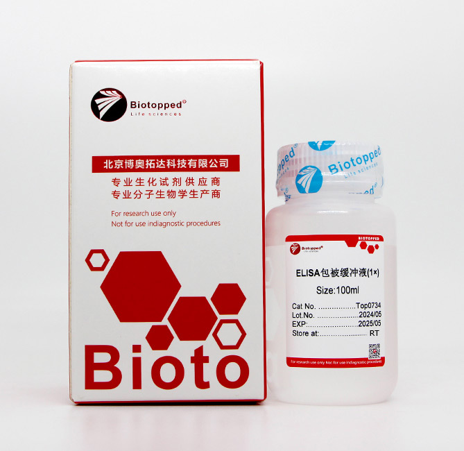 ELISA 包被缓冲液(1×)主要由碳酸钠、碳酸氢钠、防腐剂等组成,pH 值为9.6,主要用于ELISA 实验中包被 96 孔板的孔。该试剂为 1×工作液,直接使用。