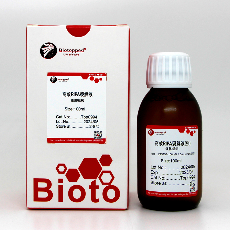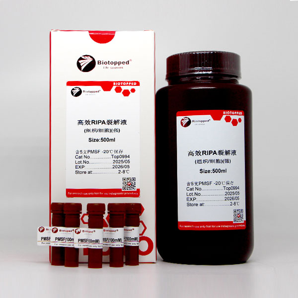 RIPA即Radio Immunoprecipitation Assay,是一种传统的组织细胞快速裂解液。RIPA裂解液(强,无PMSF)(Enhanced RIPA Lysis Buffer )裂解所得的蛋白样品可以用于常规的Western等实验,主要成分是:50mM Tris(pH 7.6)、150mM NaCl、1% TritonX-100、0.5% sodiumdeoxycholate、0.1% SDS等多种裂解剂和抑制剂。该试剂仅用于科研领域,不适用于临床诊断或其他用途。