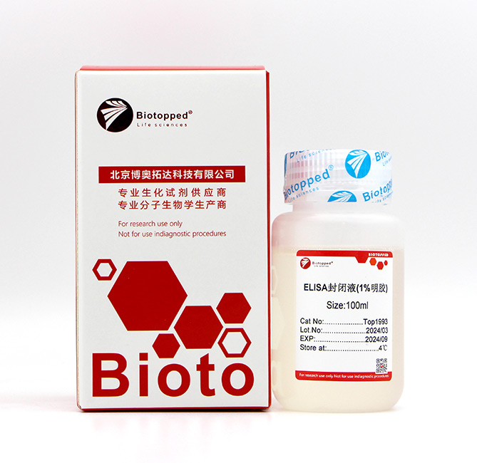 ELISA封闭液(1%明胶)主要由磷酸氢二盐、磷酸二氢盐、明胶、防腐剂等组成,主要用于ELISA实验中对96孔板或其他固相载体进行封闭处理。本试剂仅用于科研领域,不宜用于临床诊断或其他用途。