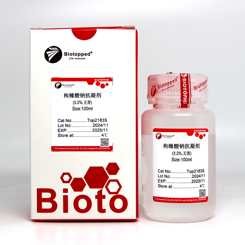 枸橼酸钠(sodium citrate)又称柠檬酸钠,常见原料为二水合柠檬酸三钠,分子量为294.12,与血液中的钙离子结合形成螯合物从而阻止血液凝固,用于血液抗凝时常选用3.2% (109mmol/L),亦可选用 3.8%(129mmol/L)或4%(136mmol/L)。