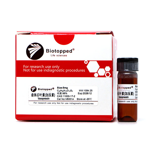 产品介绍: Vasopressin 是一种环状九肽,在下丘脑中枢合成。Vasopressin 参与下丘脑-垂体-肾上腺轴,并通过增强促肾上腺皮质激素释放因子的刺激作用调节垂体促肾上腺皮质激素分泌。Vasopressin 也可以作为一种神经递质,通过与特定的 G 蛋白偶联受体结合来发挥其作用。